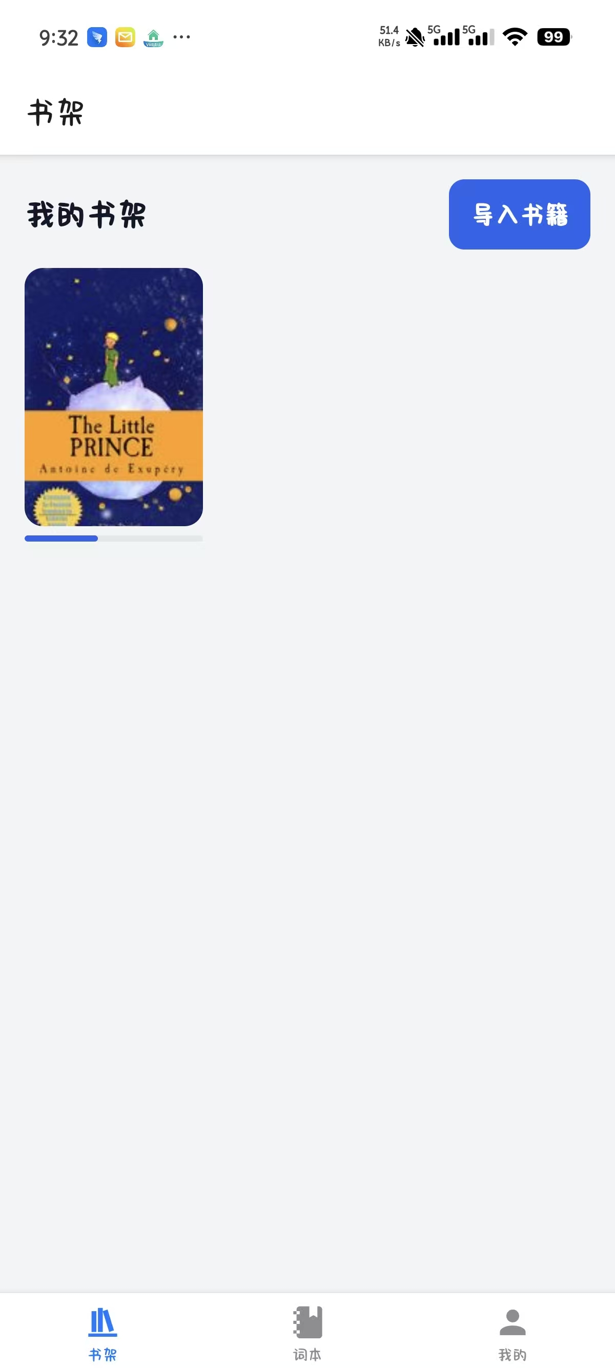 - 书架:以封面形式展示书籍,封面下方显示阅读进度条