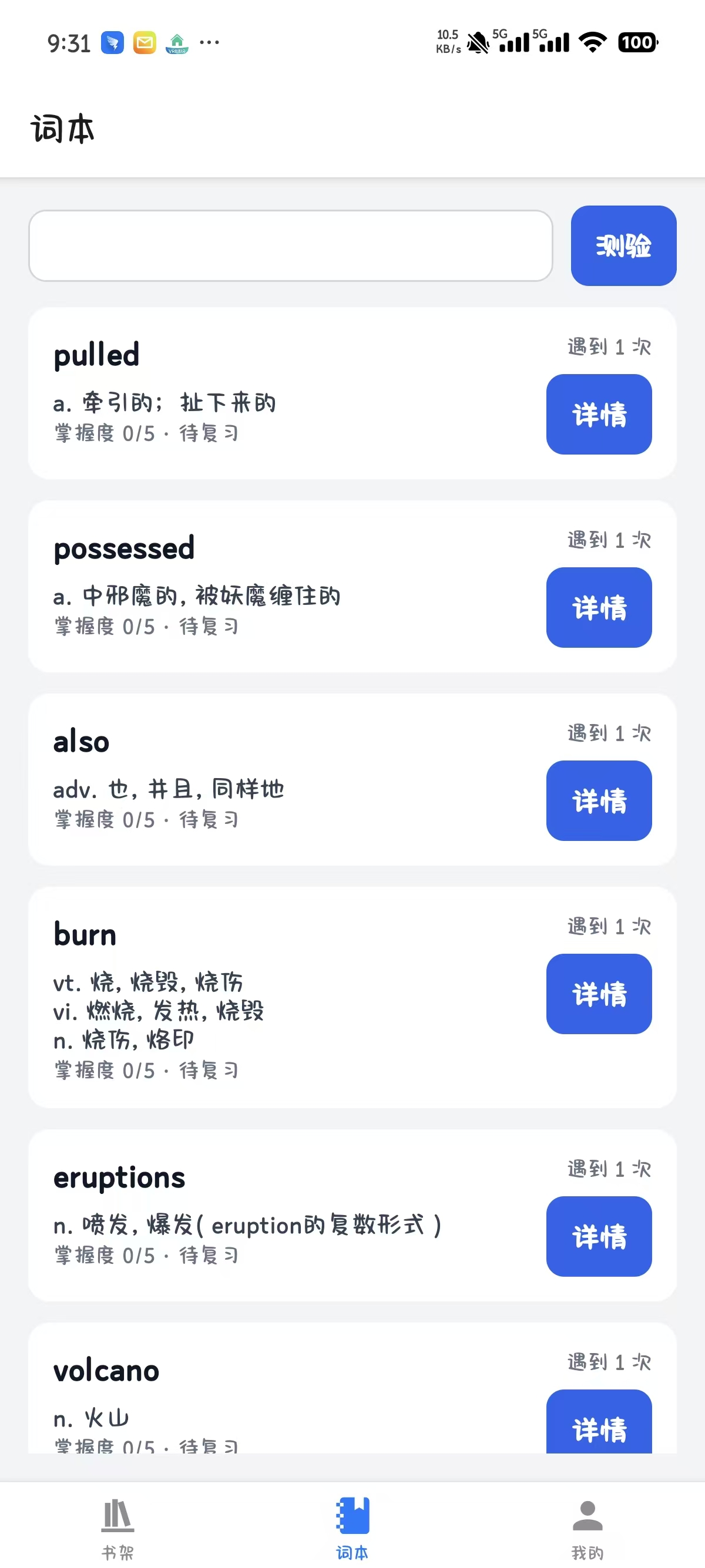 - 词本:本地持久化;掌握度(0~5)与复习/测验联动