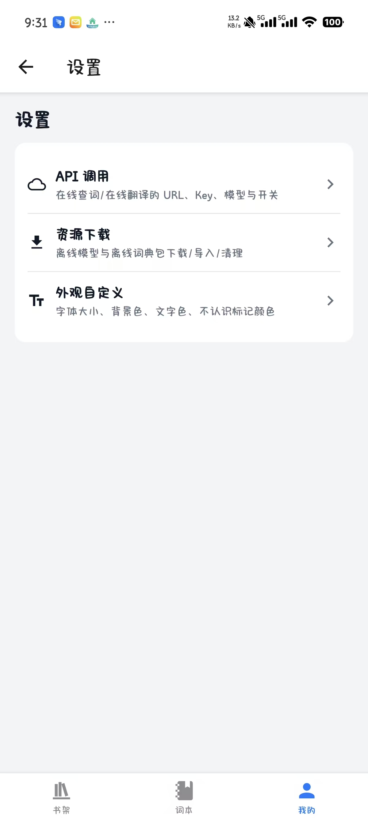 书架/词本/我的 我的:入口包含设置(二级入口)与成就设置二级入口:API 调用:在线查词/在线翻译开关 + Base URL / Key / model资源下载:离线模型下载/验证/删除 + 离线词典包下载/导入外观自定义:字体大小、背景/字体/标记颜色